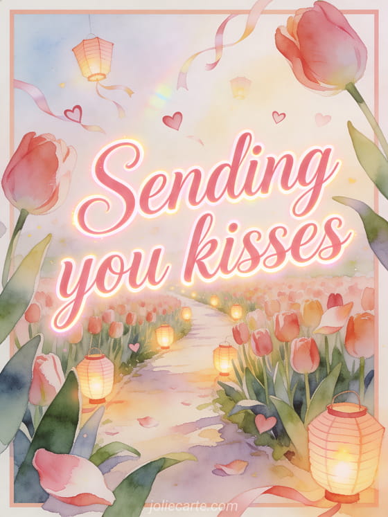 Send a tender kisses greeting with airy rose script and luminous edges. This free card follows a watercolor tulip path lined with glowing paper lanterns, drifting heart ribbons and warm gentle light. Discover also a marmot kisses gif card, a tender kisses gif card or a butterfly kisses gif card.