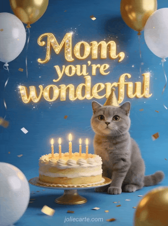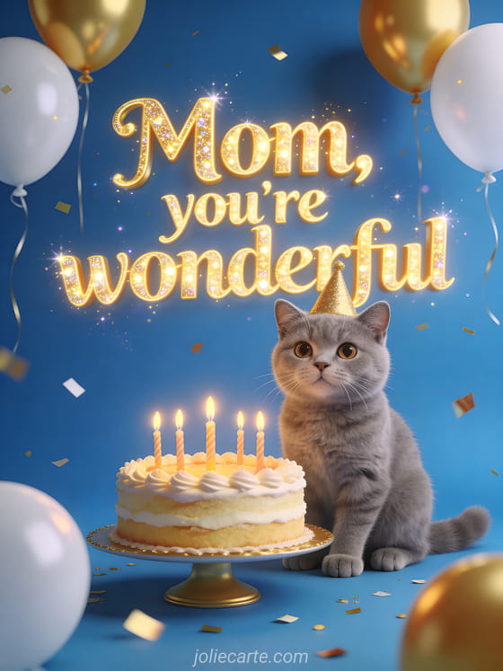Tell mom she is wonderful with a cheerful birthday card featuring a gray British shorthair cat, a glowing cake, gold balloons, and festive confetti. You can also send a happy birthday card for mom, a happy birthday mom heart card, or a birthday card for one's mom card.