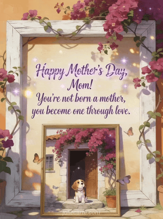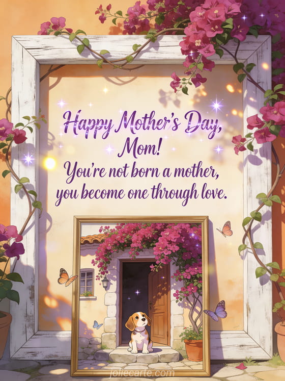 You're not born a mother, you become one through love – share this beautiful Mother's Day poem with a charming cottage scene. Discover also a heart mother's day card or mother's day images.