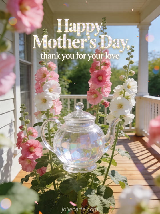 Thank Mom for her love with a bright card featuring a crystal teapot framed by tall hollyhocks on a sunlit veranda. You can also send Mother's Day celebration, how to wish your mom a happy Mother's Day or Mother's Day photo.