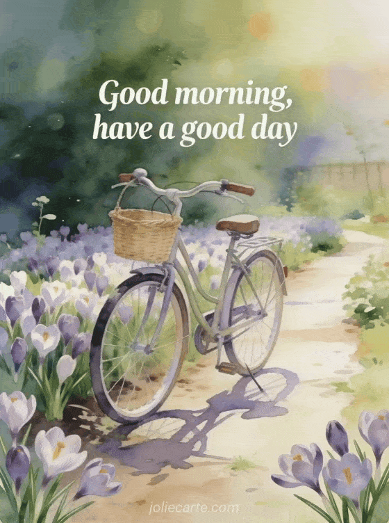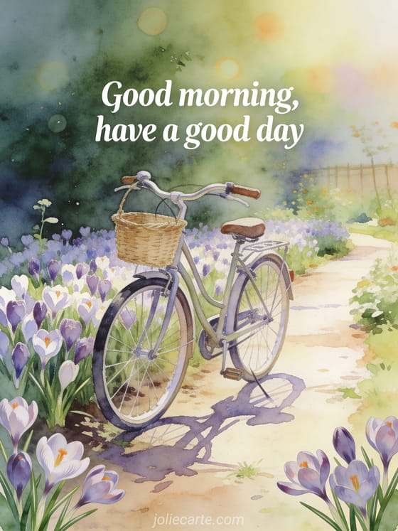 Send a cheerful card with a vintage bicycle leaning near a garden path filled with fresh crocus blooms and a small woven basket. Discover also a good morning darling message, some pretty good morning cards or an example of a good morning message.
