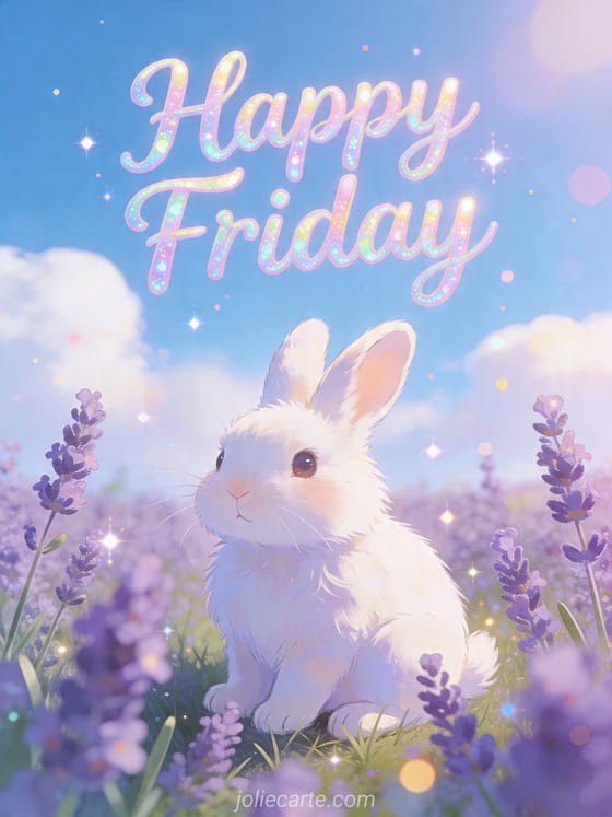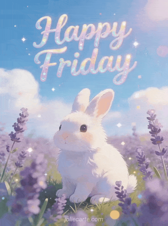 Share this joyful happy Friday card with a fluffy white rabbit, lavender blossoms, and bright sunshine. You can also discover good friday evening, positive hello friday and happy friday coffee.