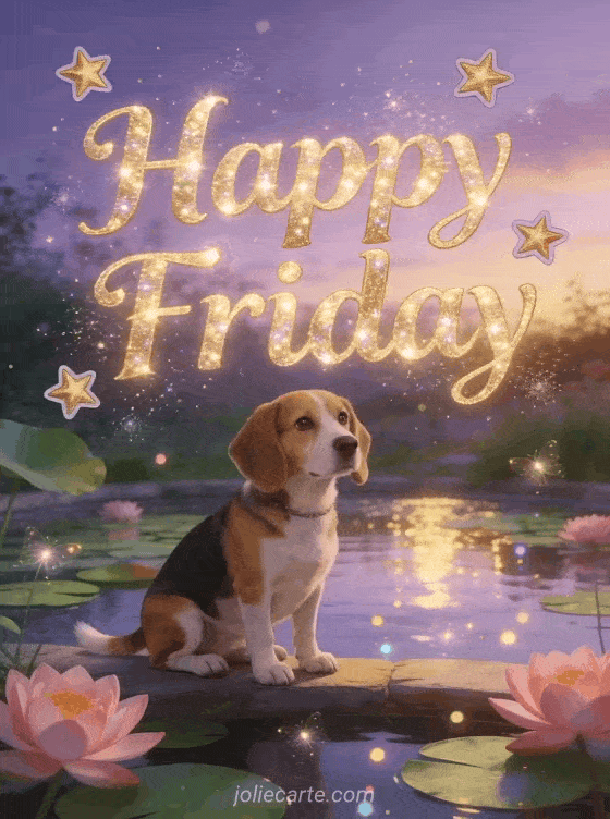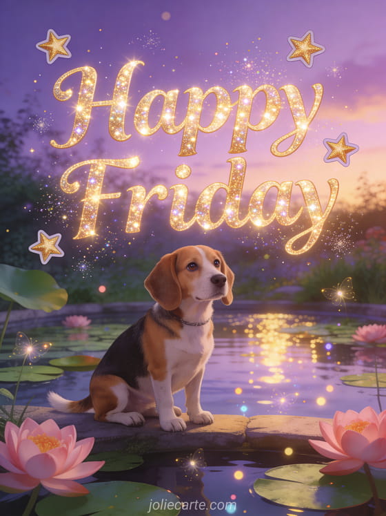 Send a sparkling happy Friday greeting with golden letters, lotus flowers, water lilies and a gentle beagle by an enchanted pond at twilight. Discover also a happy Friday good day images, a good morning excellent Friday day or a beautiful image of happy friday.