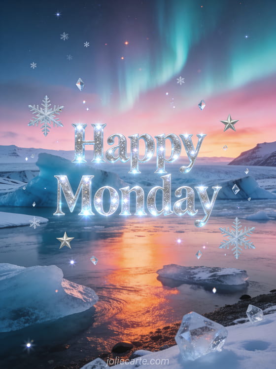 Send a sparkling happy Monday gif with frosted silver letters, icy stars and the blue icebergs of Jokulsarlon under a pink-orange sunset. Share a magical winter wish and discover also good morning happy Monday kisses image, happy sunny Monday gif or monday kisses images.