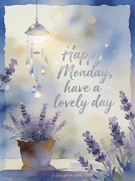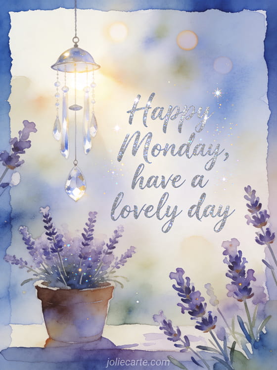 Send happy Monday, have a lovely day with silver-blue calligraphy, a crystal wind chime in sunlight, a lavender pot and sparkling morning light. Discover also happy Monday flowers gif, cold happy Monday image or happy Monday animated images.