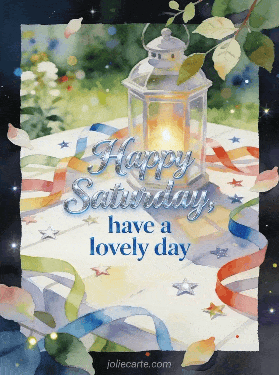 Wish a happy Saturday and a lovely day with a glowing glass lantern, colorful ribbons, star confetti and petals on a bright garden table. Discover also sunny happy saturday gif, a beautiful good morning happy Saturday image or happy saturday woman image.