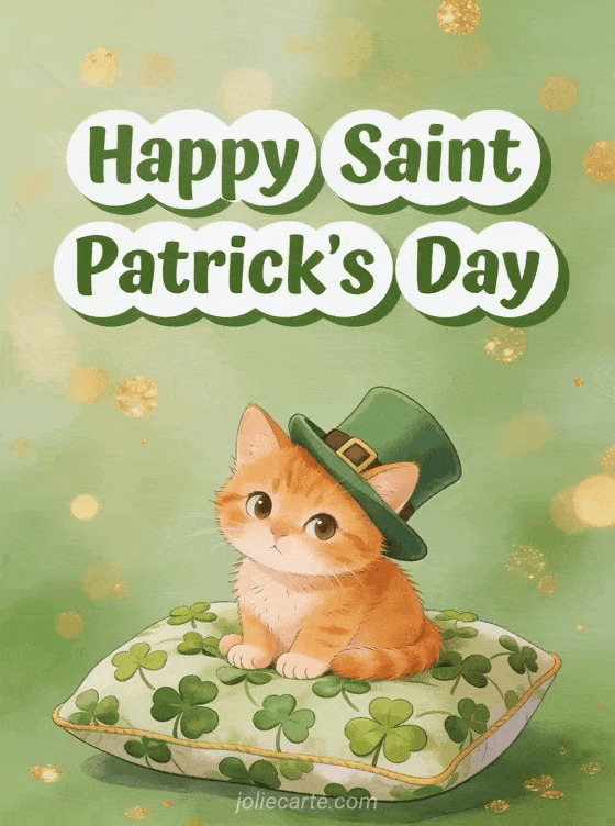 Celebrate Saint Patrick's Day with this adorable greeting card featuring a playful ginger kitten wearing a tiny leprechaun hat on a cushion of fresh shamrocks. Discover also a humorous Saint Patrick card, a Saint Patrick card or a good morning Saint Patrick card.
