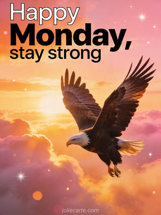Share a motivating happy Monday greeting with this inspiring eagle card full of sunrise energy. Discover also pretty happy monday image, it's raining happy monday in the rain or happy rainy monday.