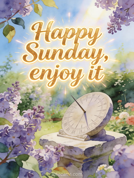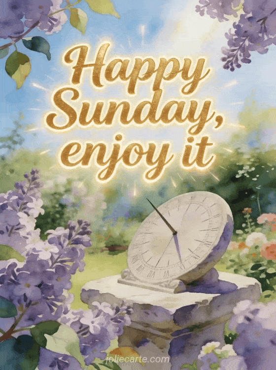 Send sunny happy Sunday gifs with golden script, a stone sundial in a blooming garden and lilac branches in clear sunshine. Discover also a gray happy Sunday image, a happy Sunday woman gif or free happy sunday gifs.