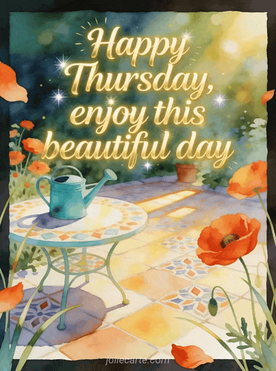 Wish a beautiful thursday with a bright garden table, a turquoise watering can, vivid poppies and warm sunbeams across patterned tiles. Discover also images for happy Thursday, a happy thursday poem or a happy Thursday blessing.