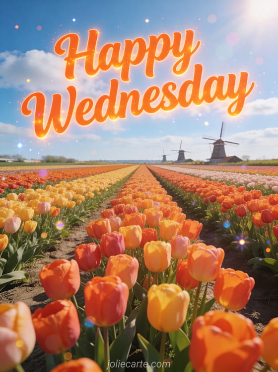 Share a cheerful sunny Wednesday with this vibrant Dutch tulip field card. Discover also a happy wednesday in the rain images card or a happy wednesday horses card.