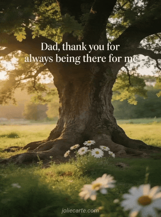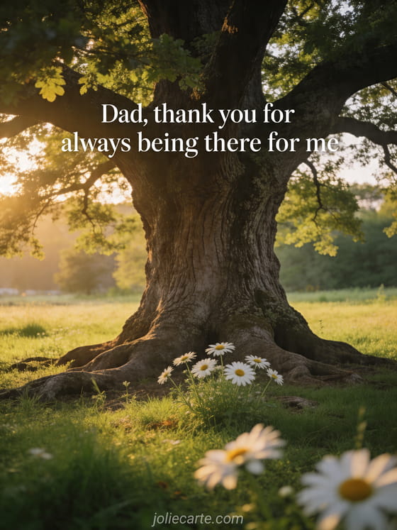 Share sweet Father's Day words with a serene image of a century-old oak in a green meadow, golden evening light and daisies at its roots. Discover also a short Father's Day quote, happy father's day dad my darling or a happy Father's Day Dad touching text.