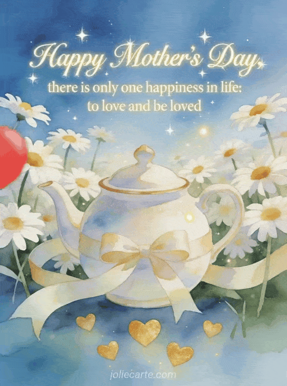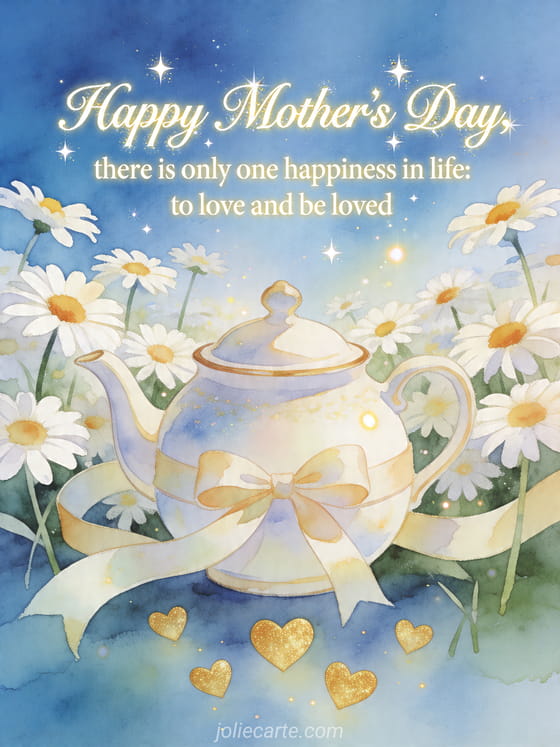 Share a poetic Mother's Day card with radiant ivory calligraphy, a daisy field, a ribboned teapot, and floating golden hearts under a glowing blue sky. Discover also a drawing for Mother's Day, a Happy Mother's Day card, or Mother's Day photographs.
