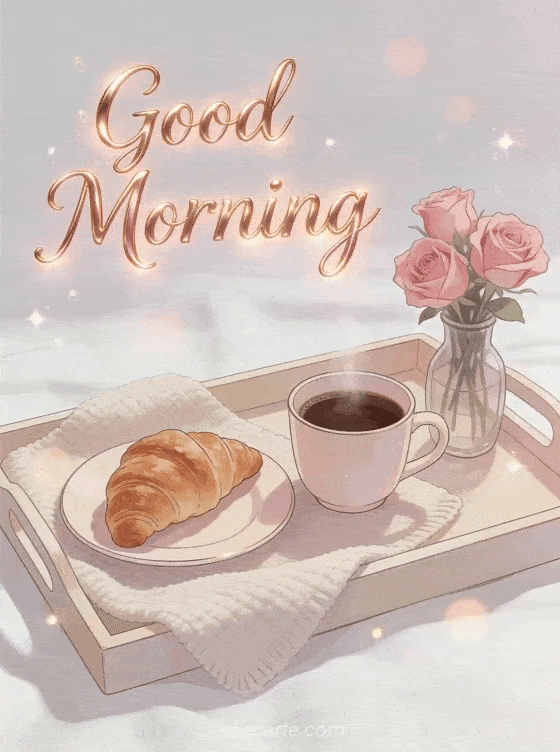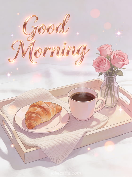 A warm and tender good morning card with a steaming coffee cup beside a fresh croissant on a cozy breakfast tray with a small vase of pink roses and soft morning light. Discover also a good morning text, a cute good morning text message or a good morning card.