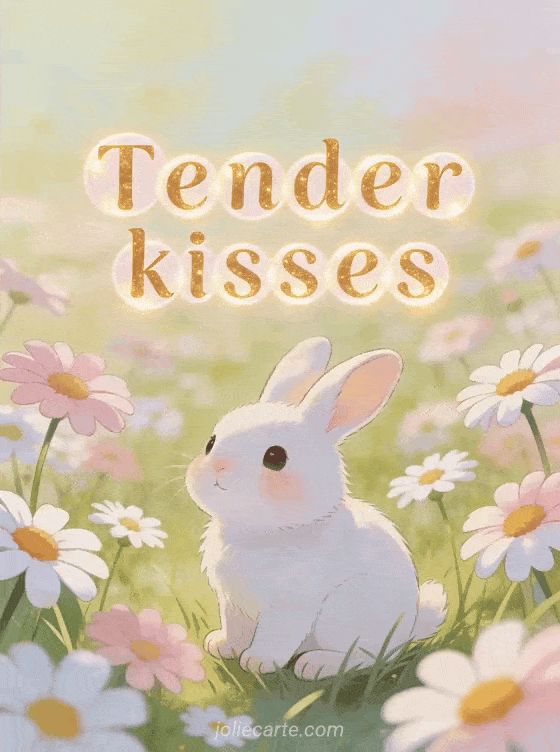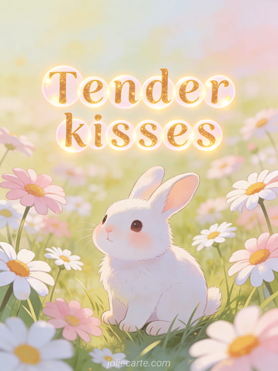 Send sweet tender kisses with this charming animated greeting card featuring a white rabbit in a sunny daisy field. Discover also a big kisses card or a kisses free clipart.