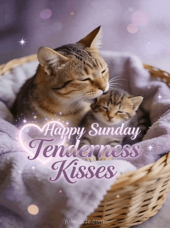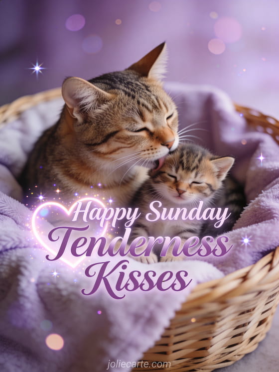 Send a heartwarming happy Sunday greeting with a mother cat tenderly grooming her kitten in a cozy basket. A sweet and tender way to wish someone a wonderful Sunday full of love. Discover also a Sunday morning card or a happy Sunday card.