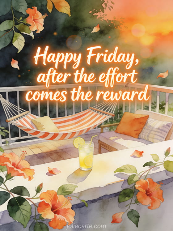 Wish a restful Friday with sunset-orange lettering, hibiscus petals, a quiet terrace, a striped hammock, lemonade and warm light. Discover also happy Friday butterfly image, happy Friday animated images or happy Friday animated gif image.