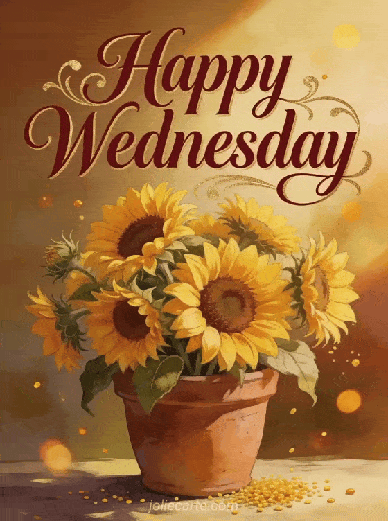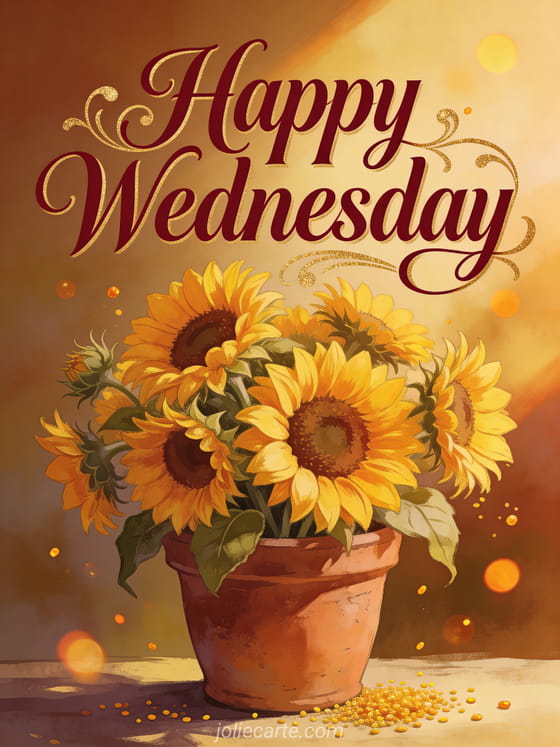 Send a warm happy Wednesday greeting with sunflowers arranged in a rustic terracotta pot, golden summer light and soft countryside charm. Discover also happy Wednesday with animals, animated happy Wednesday image or good morning have a nice day have a nice Wednesday.