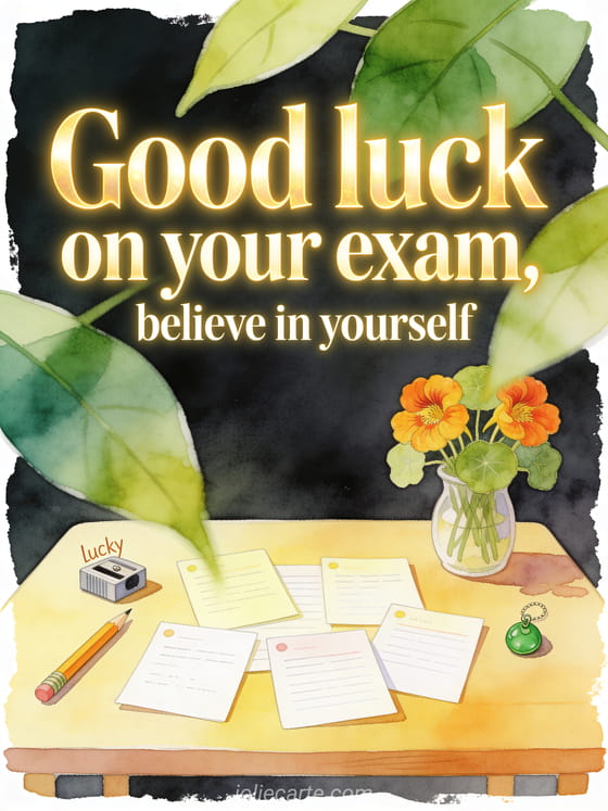 Support someone before an exam with this confident watercolor card, featuring flashcards, a lucky pencil sharpener, a green charm, and nasturtium flowers. Discover also animated good luck gifs, good luck message for a competition, or good luck image with a horse.