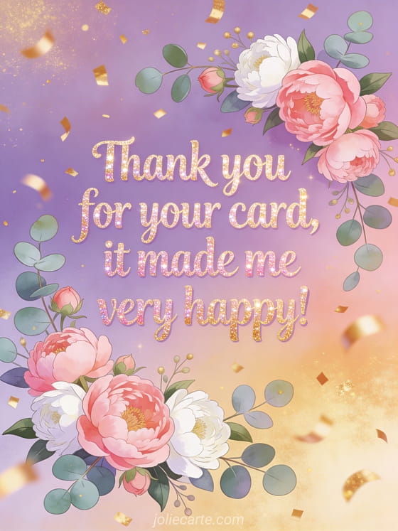 Express your gratitude for a card that made you happy with this free greeting. Discover also a what to reply when you receive a card or a thank you for your card text card.