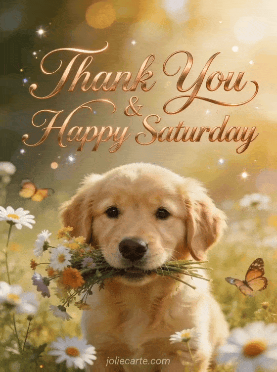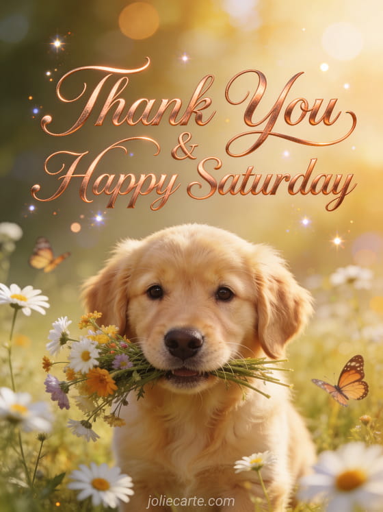 Share gratitude and weekend joy with this thank you and happy saturday card featuring a grateful golden retriever puppy holding a bouquet in a sunny meadow. Discover also a lovely saturday and happy weekend or a happy saturday cat image card.
