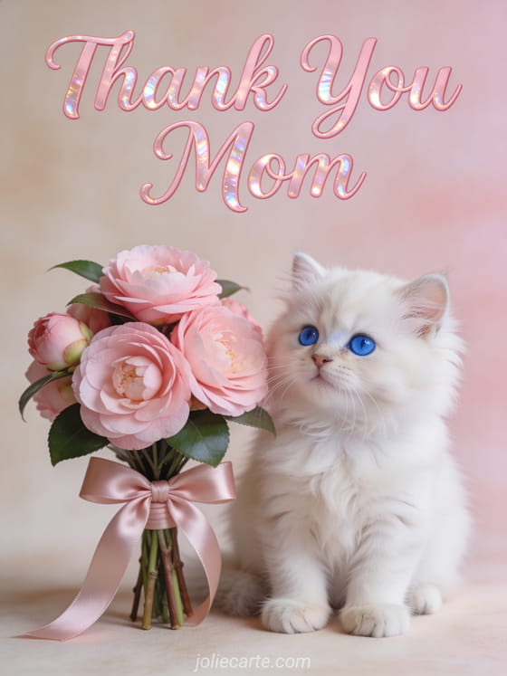 Show your gratitude to mom with this heartwarming free greeting card. A photorealistic white Persian kitten with blue eyes sits next to a delicate bouquet of pink camellias tied with a satin ribbon, on a soft pink background. Discover also a Mother's Day flower card, a Mother's Day greeting card or a card with sweet words for mom.