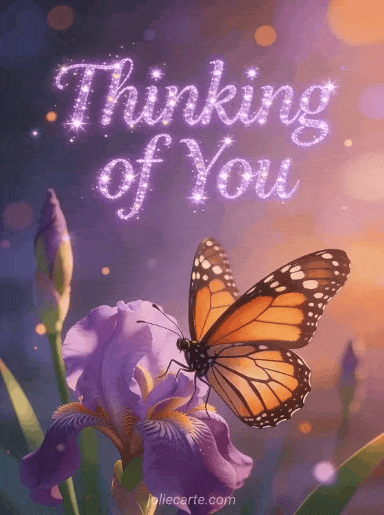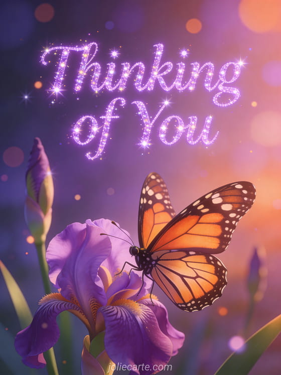 Express your thoughts with this elegant thinking of you card featuring a stunning monarch butterfly landing on a purple iris. Discover also a thinking of you note or a thinking of you message.