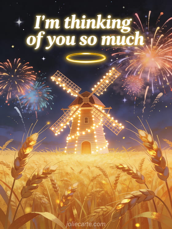 Share this festive thinking of you card featuring a golden wheat field windmill under a fireworks sky. Discover also a thinking of you free image or a send thinking of you message.
