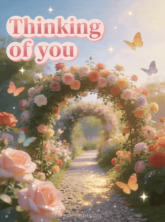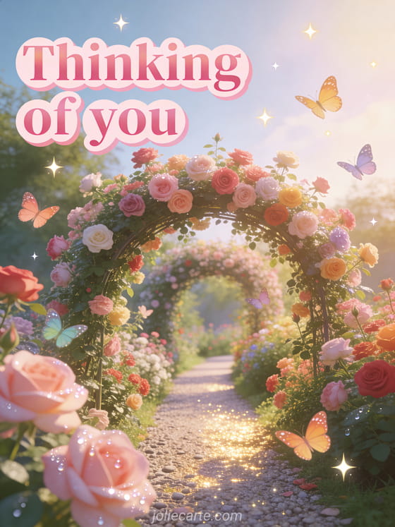 Share this luminous rose garden card with arches of climbing roses and morning dew to tell a friend you're thinking of them. Discover also a thinking of you so much my friend card or a thinking of you drawing card.
