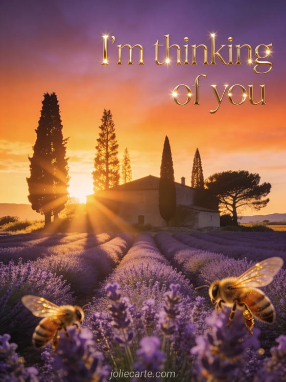 Share this stunning thinking of you card with Provençal lavender fields at golden hour. Discover also a beautiful day thinking of you or thinking of you so much gif.