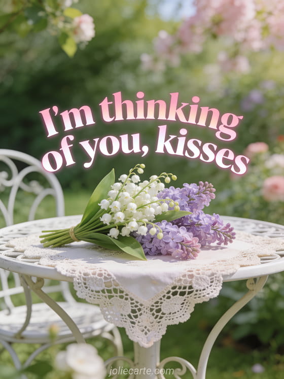 Share beautiful thinking of you kisses images with a delicate bouquet of lily of the valley and lilac on a lace doily in a fresh spring garden. Discover also a thinking of you baby card, a romantic thinking of you image or a falling asleep thinking of you message card.