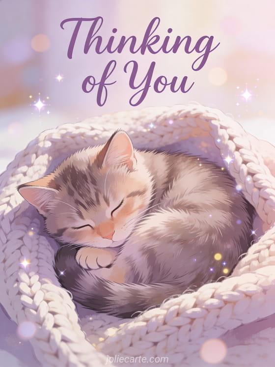 Share a heartfelt thinking of you message with this dreamy card of a sleeping kitten in a soft knitted blanket. Discover also a flower bouquet thinking of you or a thinking of you ecard.