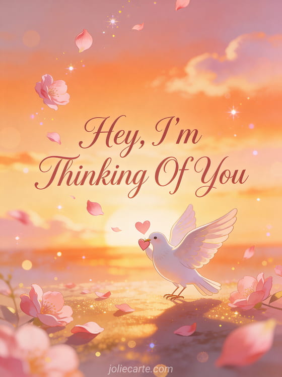 Send a heartfelt thinking of you card to someone special with this beautiful free card. A loving dove holding a small heart with floating pink petals against a romantic sunset, to let them know you are thinking of them. Discover also a hey good morning funny card or a hello kisses card.
