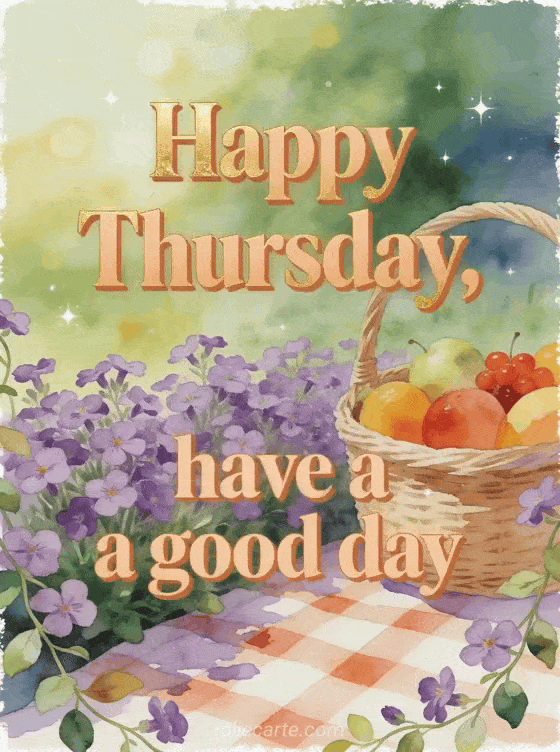 Share a Thursday good day greeting with apricot lettering, a picnic basket filled with bright fruit, purple aubrieta and checkered fabric. Discover also a happy Thursday photo gif, happy Thursday rain or good morning happy Thursday and good day.
