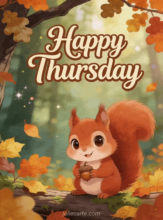 Send a funny happy Thursday greeting with this adorable squirrel card full of autumn warmth. Discover also a nice day thursday funny, a happy sunny thursday image or a good morning its thursday gif.