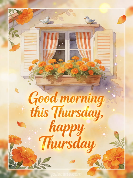 Share good morning this Thursday, happy Thursday with orange calligraphy, a cottage window box overflowing with marigolds, striped curtains and tiny ceramic birds. Discover also happy Thursday kisses images, good morning happy Thursday landscape or beautiful Thursday kisses.