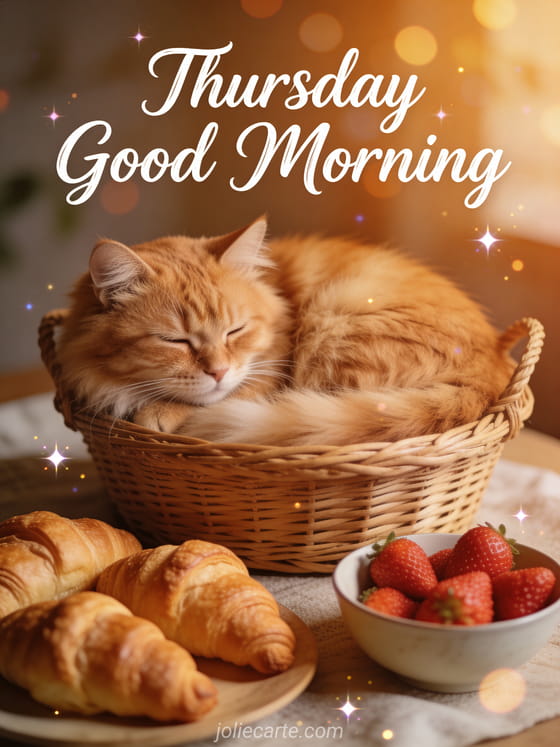 Start your Thursday morning with charm by sending this cozy card. A fluffy ginger cat is curled up in a wicker basket next to fresh baked croissants and strawberries in a warm amber glow. Discover also a happy Thursday card or a Thursday message card.