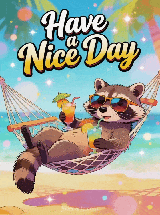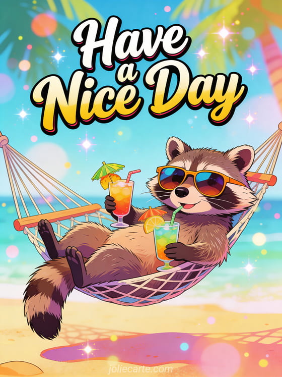 Brighten someone's day with this hilarious card. A silly raccoon wearing oversized sunglasses relaxes in a hammock with tropical drinks in a summer vacation scene. Discover also a happy Thursday kisses card or a wishing you a happy Thursday card.