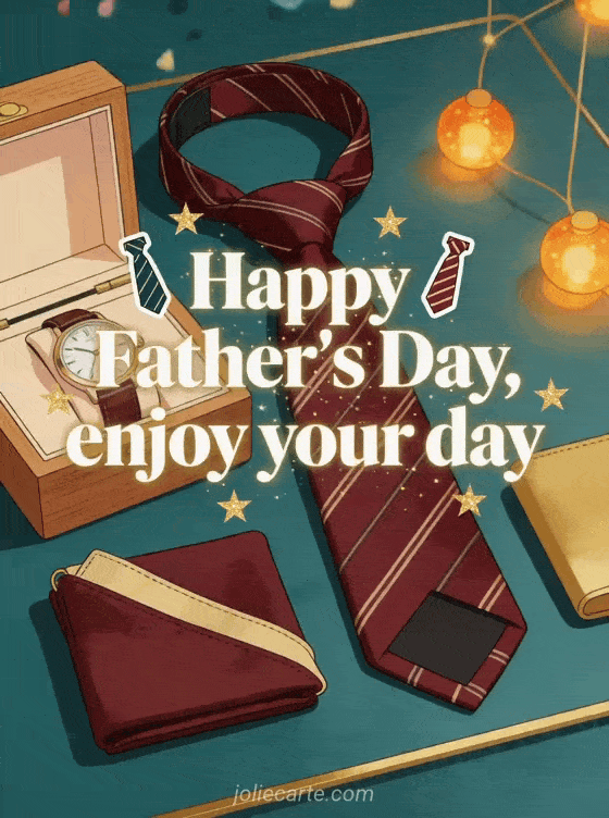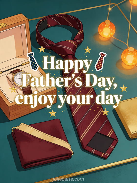 Send a tie card for father's day with bold ivory serif lettering, mini necktie stickers, golden stars, an elegant silk necktie, a wooden watch box, folded pocket square and warm amber lights. Discover also joyful father's day, a father's day tie card or a happy Father's Day dad card.