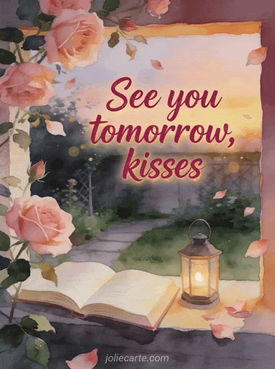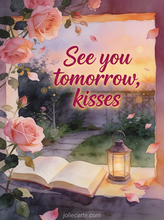 Share tomorrow kisses gif with deep raspberry cursive, pink rose blossoms, loose petals, an open book and a small lantern in a quiet evening garden nook. You can also send kisses until tomorrow or kisses see you tomorrow gif for another tender goodbye.