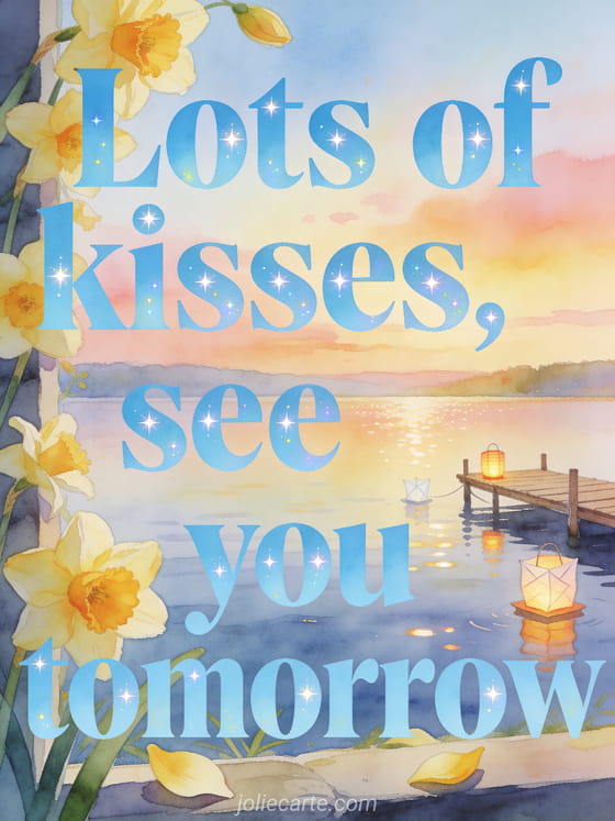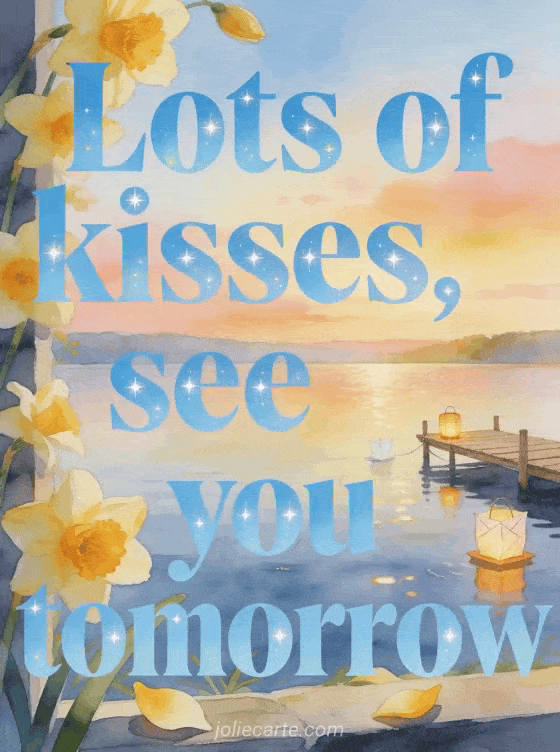 Share a tender card with sky-blue lettering, fresh daffodils spilling over the border, a quiet lake, a small wooden dock and floating paper lanterns at sunset. You may also like see you tomorrow good evening kisses, big kisses and see you tomorrow or good evening see you tomorrow images.