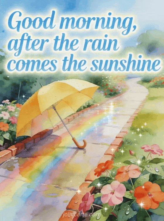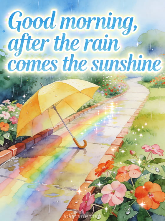 Send a touching good morning message with hopeful sky blue watercolor lettering, a bright umbrella, a rainbow-lit garden path, impatiens and sparkling raindrops. Discover also early morning good morning message, animated virtual good morning card or a good morning message for my girlfriend.