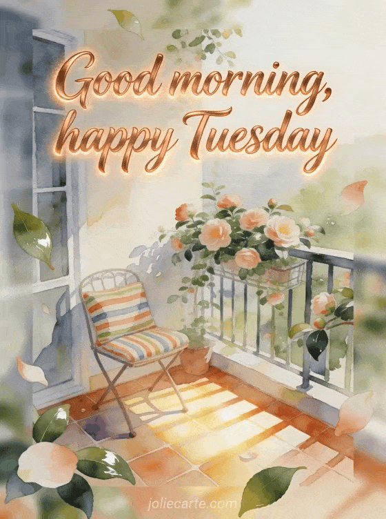 Send a warm good morning and happy Tuesday greeting with copper calligraphy and a soft luminous edge. This free card shows a peaceful balcony with camellias, a small chair, a striped cushion and sunbeams across painted floor tiles. Discover also a cold happy Tuesday image card, beautiful images for happy Tuesday or a good morning Tuesday animated gif card.