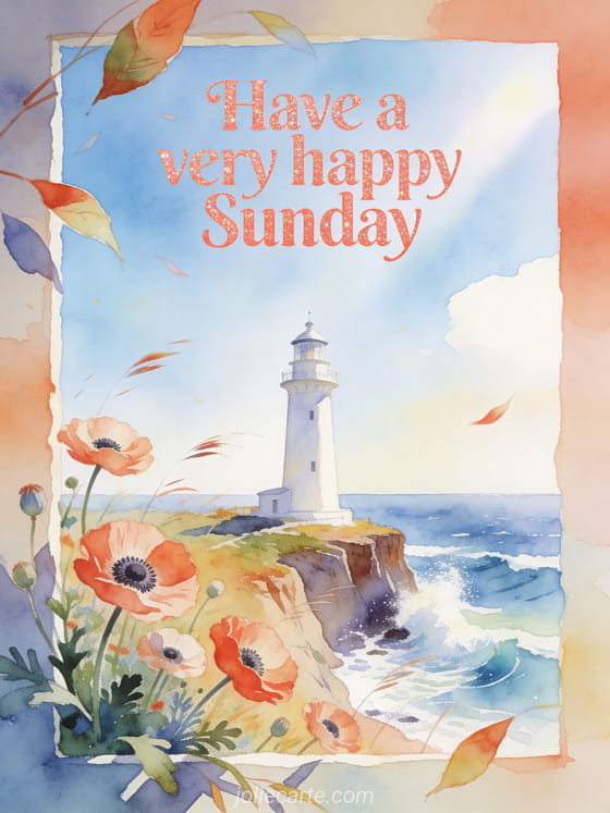 Share a very happy Sunday with a white lighthouse on a radiant seaside cliff, waves below, anemones and windblown leaves. Discover also happy Sunday sparkling animated gif animated gif, a beautiful free happy sunday image or a beautiful happy Sunday text.
