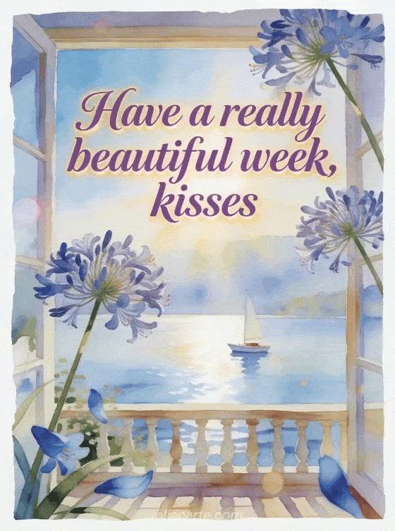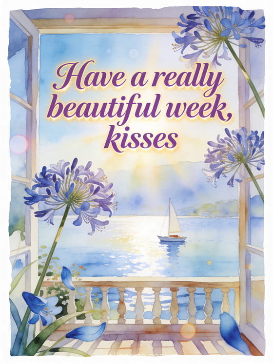 Wish a beautiful week with refined violet watercolor lettering, agapanthus stems, blue petals, a serene lakeside terrace, a small sailboat, radiant afternoon light, and peaceful joy. Discover also a happy Monday great week kisses card, a lovely Christmas week kisses card, or a kisses and great week card.