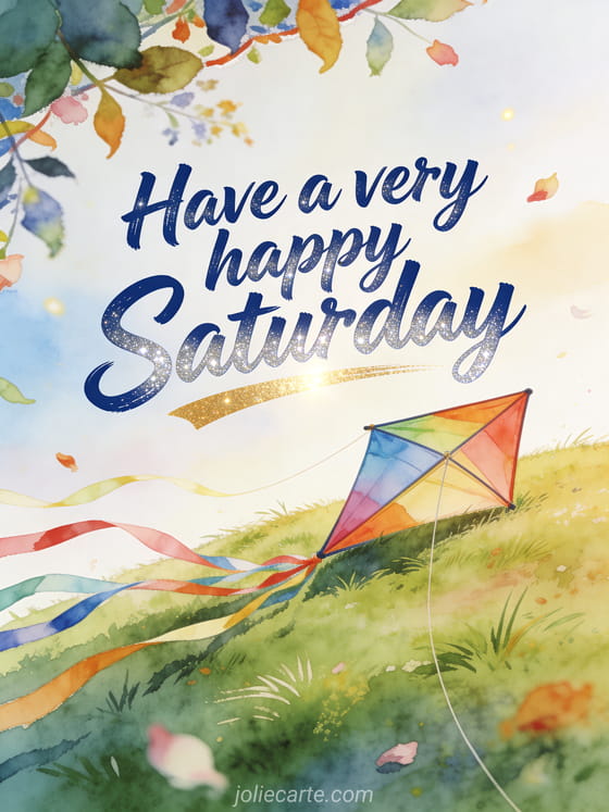 Bring weekend energy with a watercolor kite resting on a grassy hill, flowing ribbons, wild leaves, petals, and clear golden light. Discover also free happy Saturday and good weekend images, happy saturday and weekend image, or happy Saturday flowers images.