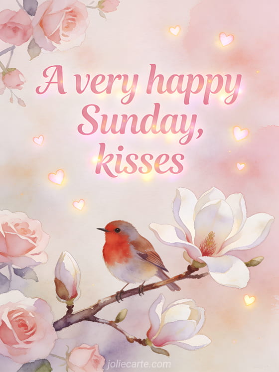 Send a very happy Sunday with tender kisses, soft pink light and a robin perched on blooming magnolia. Discover also happy Sunday animated gifs gif, a pretty happy sunday card or happy Sunday in the rain humor.