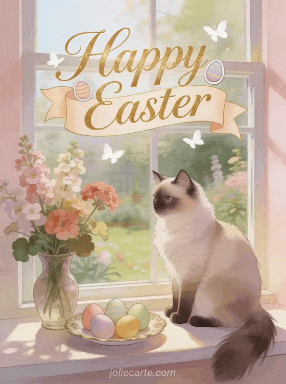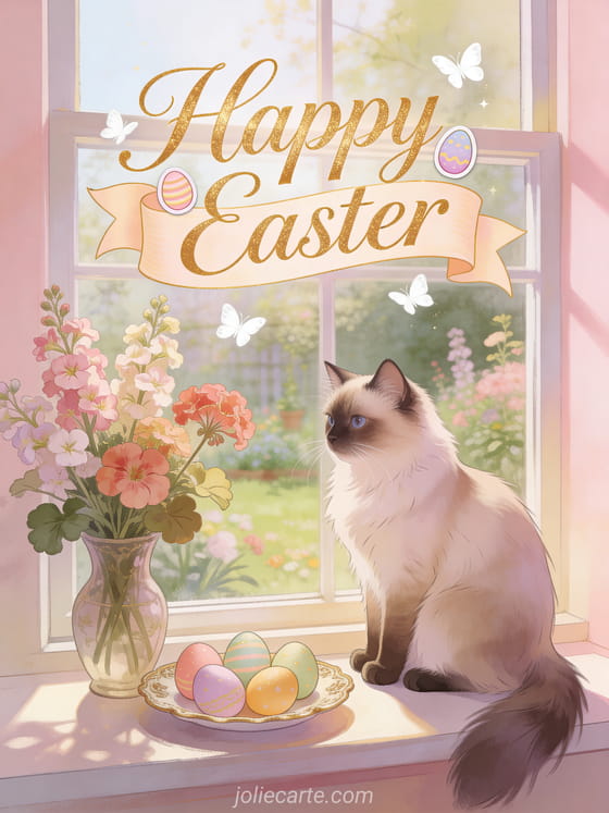 Send this charming virtual Easter card featuring a Birman cat sitting on a windowsill beside a vase of marigolds and geraniums, decorated Easter eggs on a vintage plate, and a spring garden visible through the window. Warm and cozy illustration. Discover also a Easter card, a Easter greeting or a Easter cards collection.
