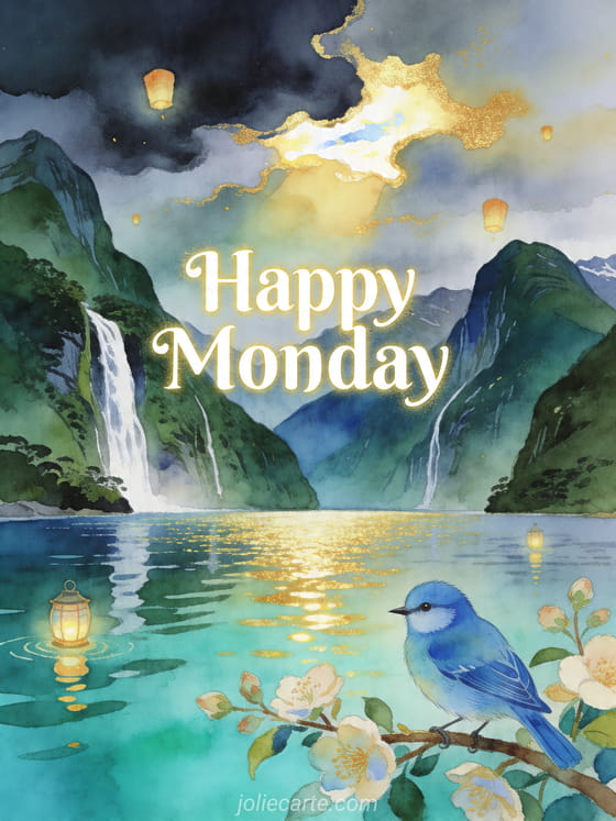 Share a peaceful Happy Monday greeting with majestic waterfalls, a calm fjord and a delicate blue tit. Discover also happy monday e-card, happy monday card and good morning monday morning.
