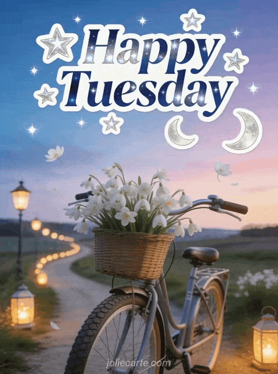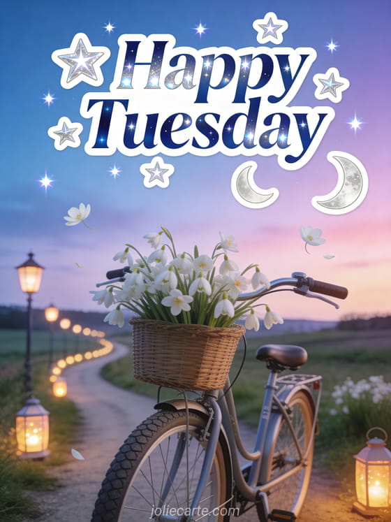 Send a romantic Happy Tuesday card with midnight blue letters, silver highlights, sparkling stars, small moons and a vintage bicycle with a basket full of white daisies on a winding country path at blue hour. Discover also good morning happy tuesday image, happy tuesday card or funny happy Tuesday humor image.